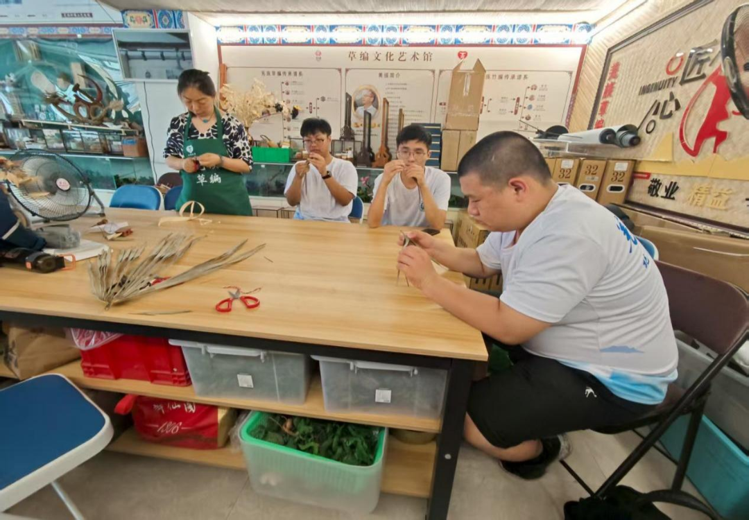 在北川羌族草编研学体验中心,非遗传承人江福容老师向团队成员展示着羌族草编技艺。成员们学着江老师的样子编织,看似普通的棕榈叶在手中却总是不听使唤。江老师耐心地指导大家调整力度,感受材料的韧性而不是生硬地掰折。在江老师手把手地教学后,大家又独立尝试,在动手和交流中,一只只歪歪扭扭却不失形色的蚂蚱诞生了。