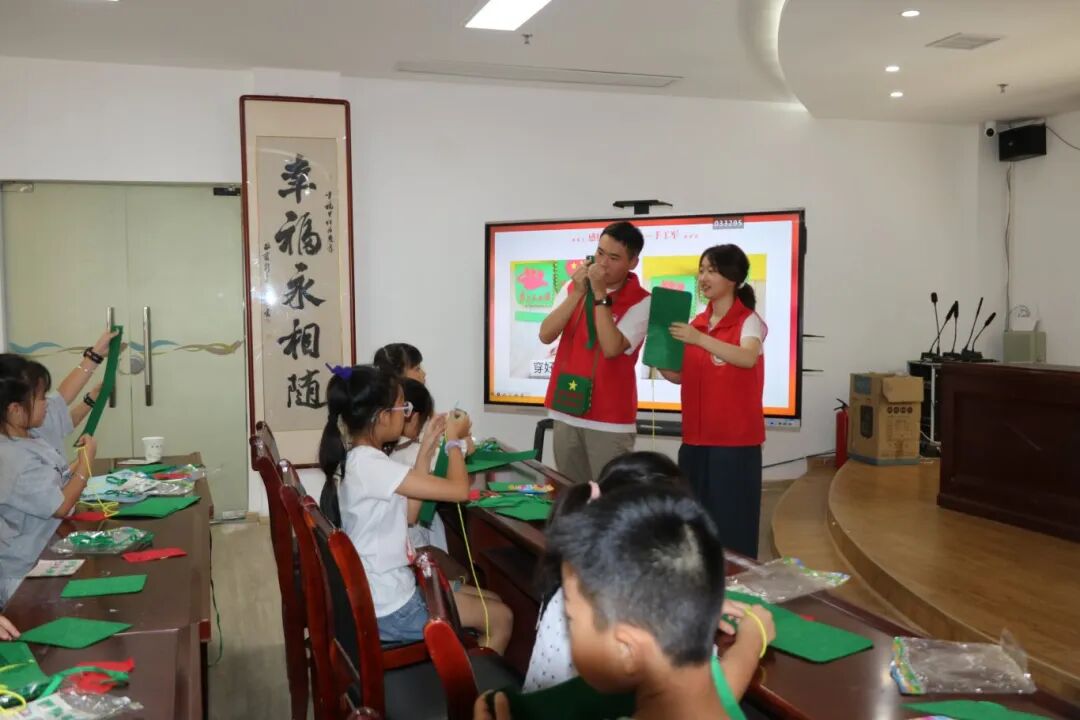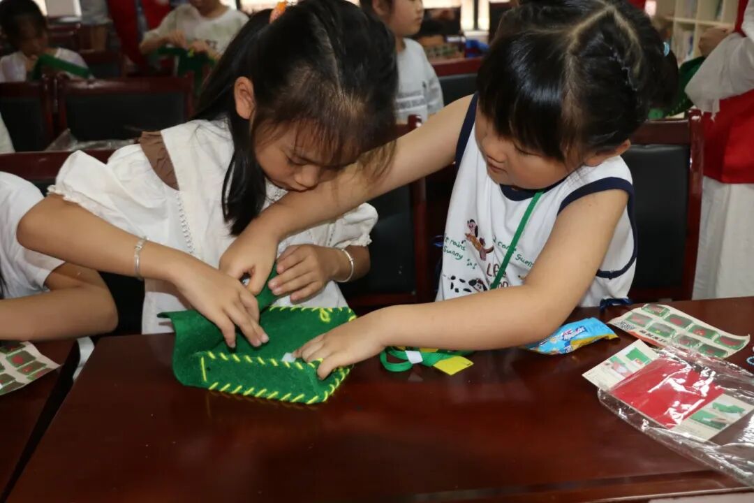 “赣鄱薪火·洪城弘志”实践队队员为小朋友们讲解手工军包制作过程