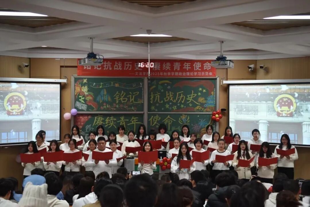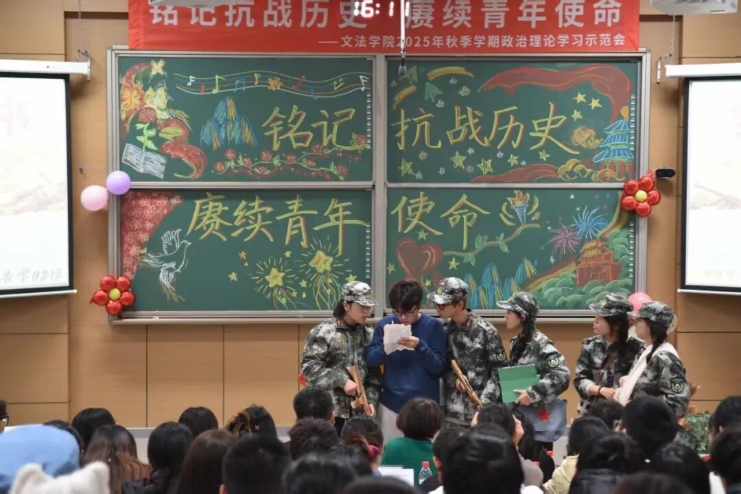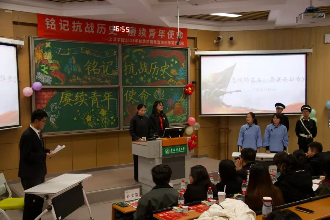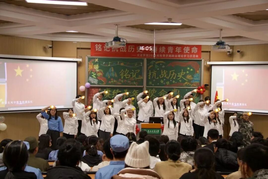 为深入贯彻落实党的二十大和二十届四中全会精神,进一步激发青年学生的爱国主义情怀,鼓励新时代青年挺膺担当,躬身入局,永利yl23411团委联合大学生理论指导中心于10月29日下午在锦绣楼T301开展了以“铭记抗战历史,赓续青年使命”为主题的政治理论学习示范会。