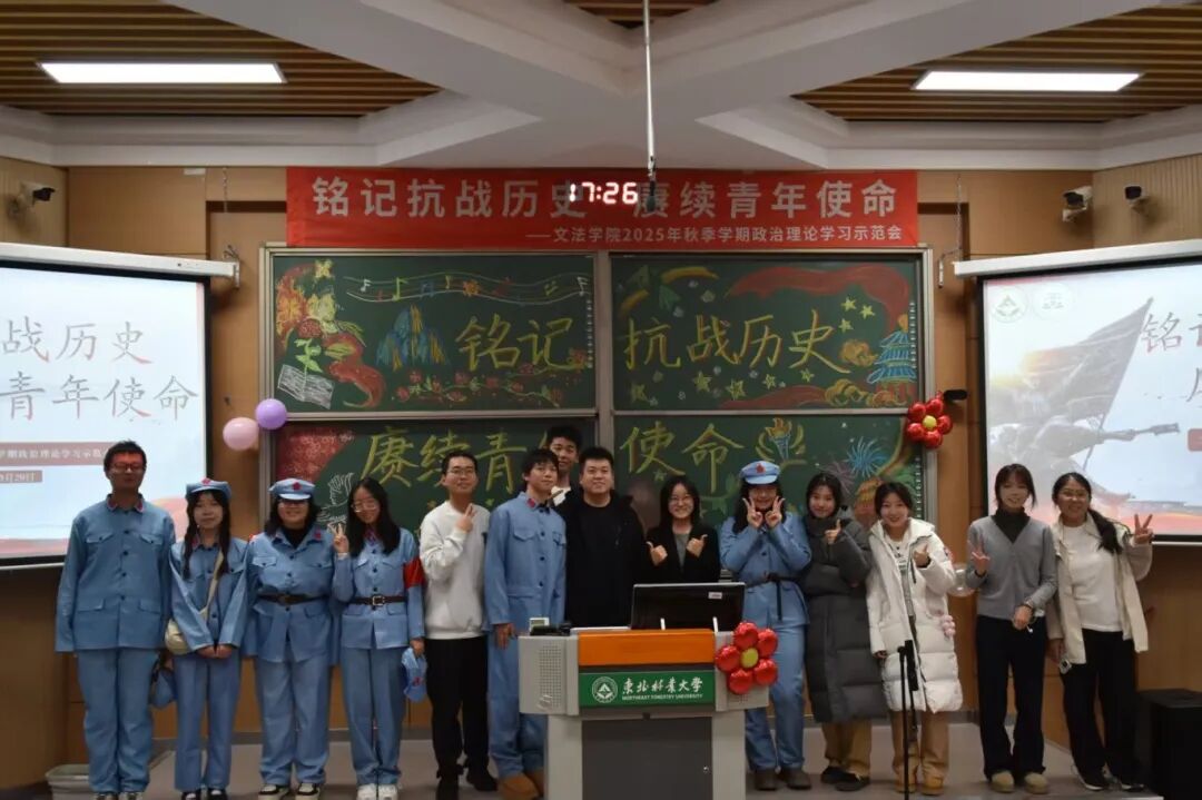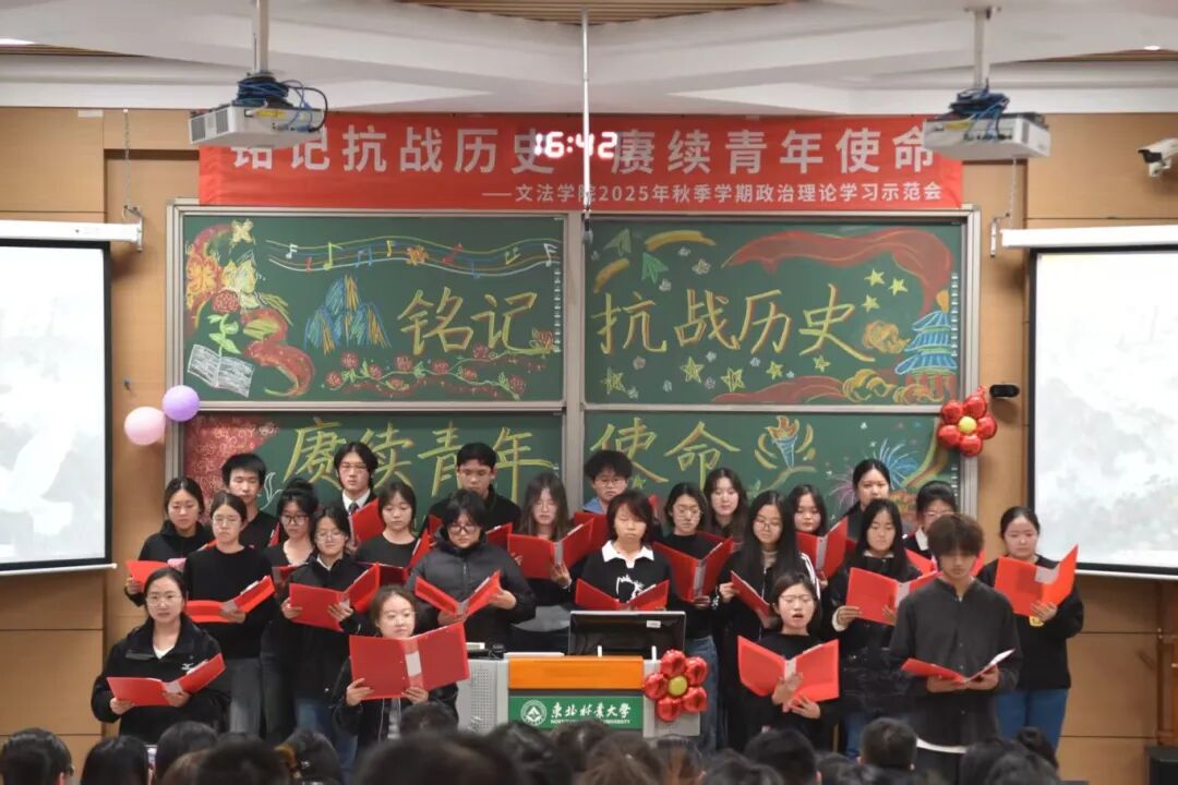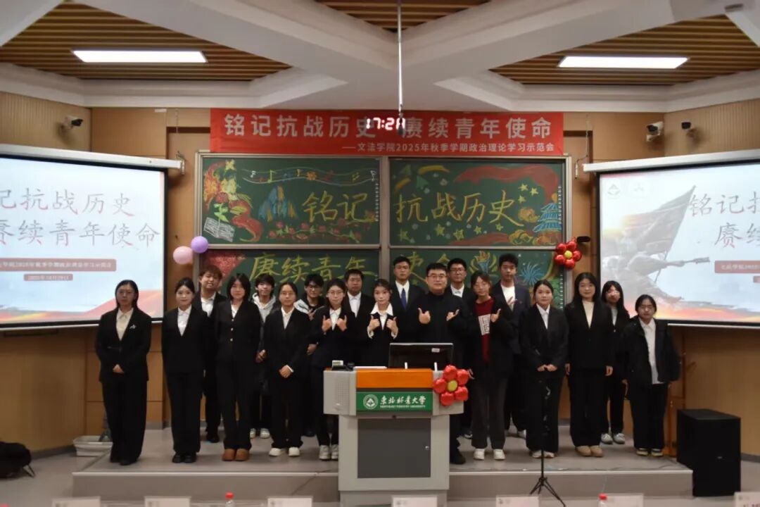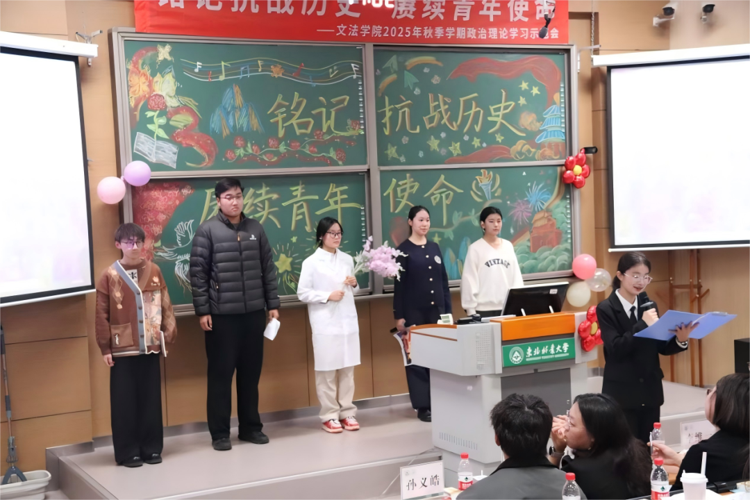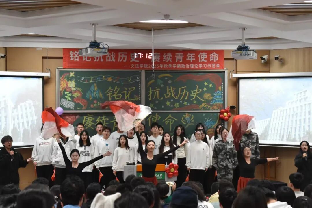 为深入贯彻落实党的二十大和二十届四中全会精神,进一步激发青年学生的爱国主义情怀,鼓励新时代青年挺膺担当,躬身入局,永利yl23411团委联合大学生理论指导中心于10月29日下午在锦绣楼T301开展了以“铭记抗战历史,赓续青年使命”为主题的政治理论学习示范会。