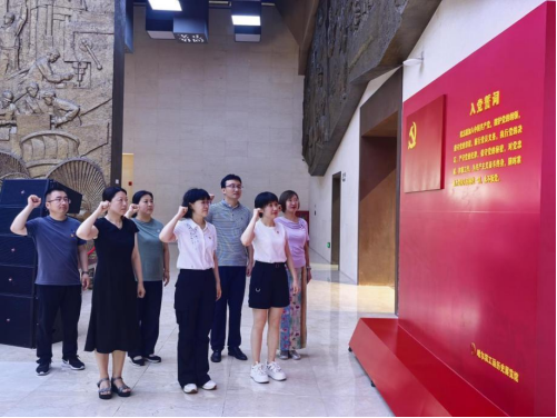 在工运馆党旗前,全体党员庄严列队,在支部副书记平爱红同志的带领下重温入党誓词。铿锵有力的誓言回荡在展馆中,彰显了支部党员赓续红色血脉、勇担时代重任的坚定决心。邹丽梅副院长与党员们一同宣誓,并在随后的讲话中强调:“工运精神体现了中国共产党与人民群众的血肉联系,我们要在教育教学中弘扬这种精神,引导学生树立正确的价值观,培养担当民族复兴大任的时代新人。”
